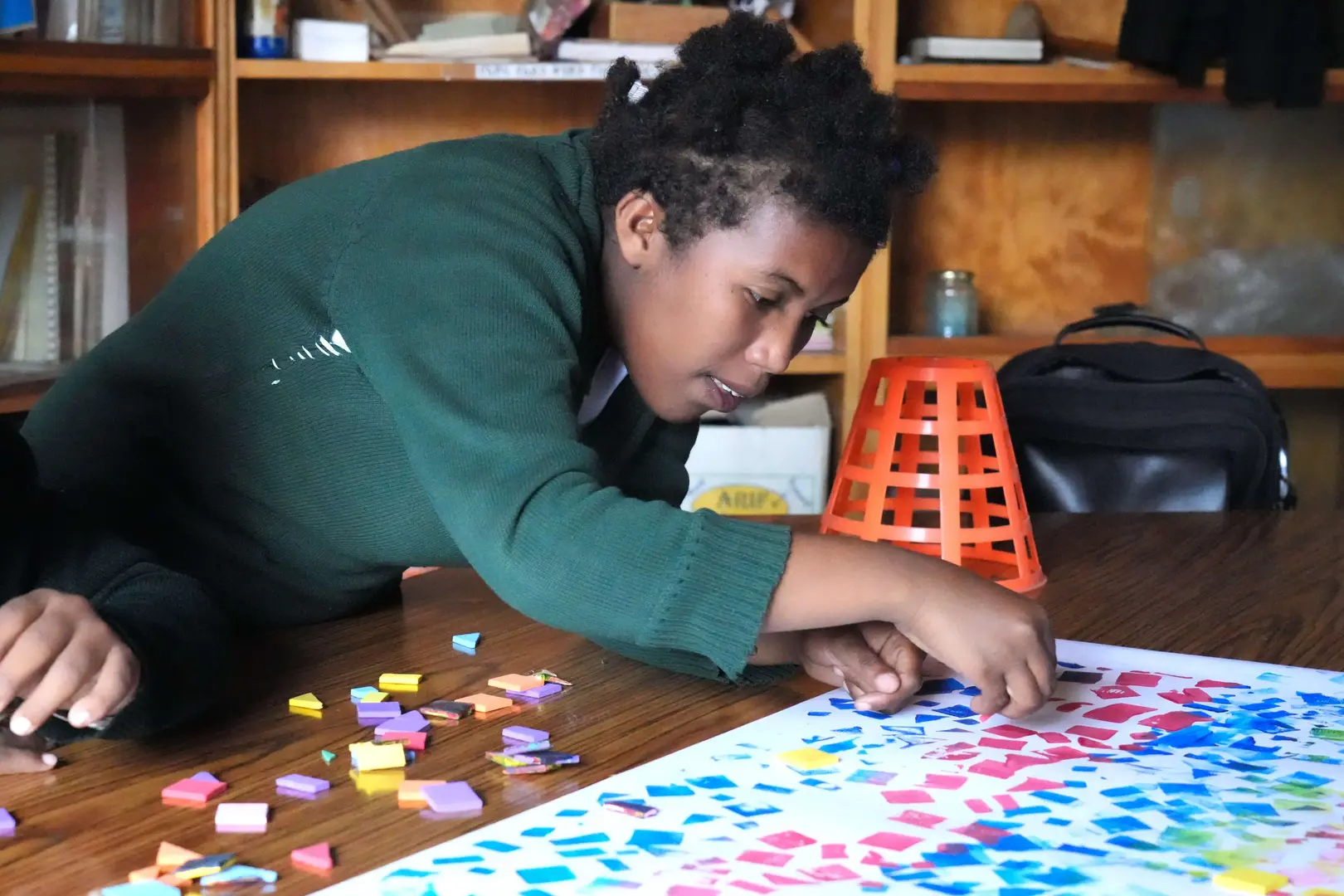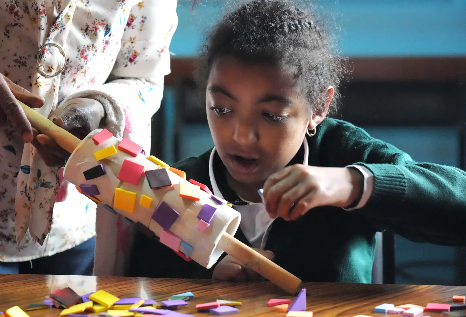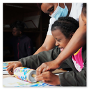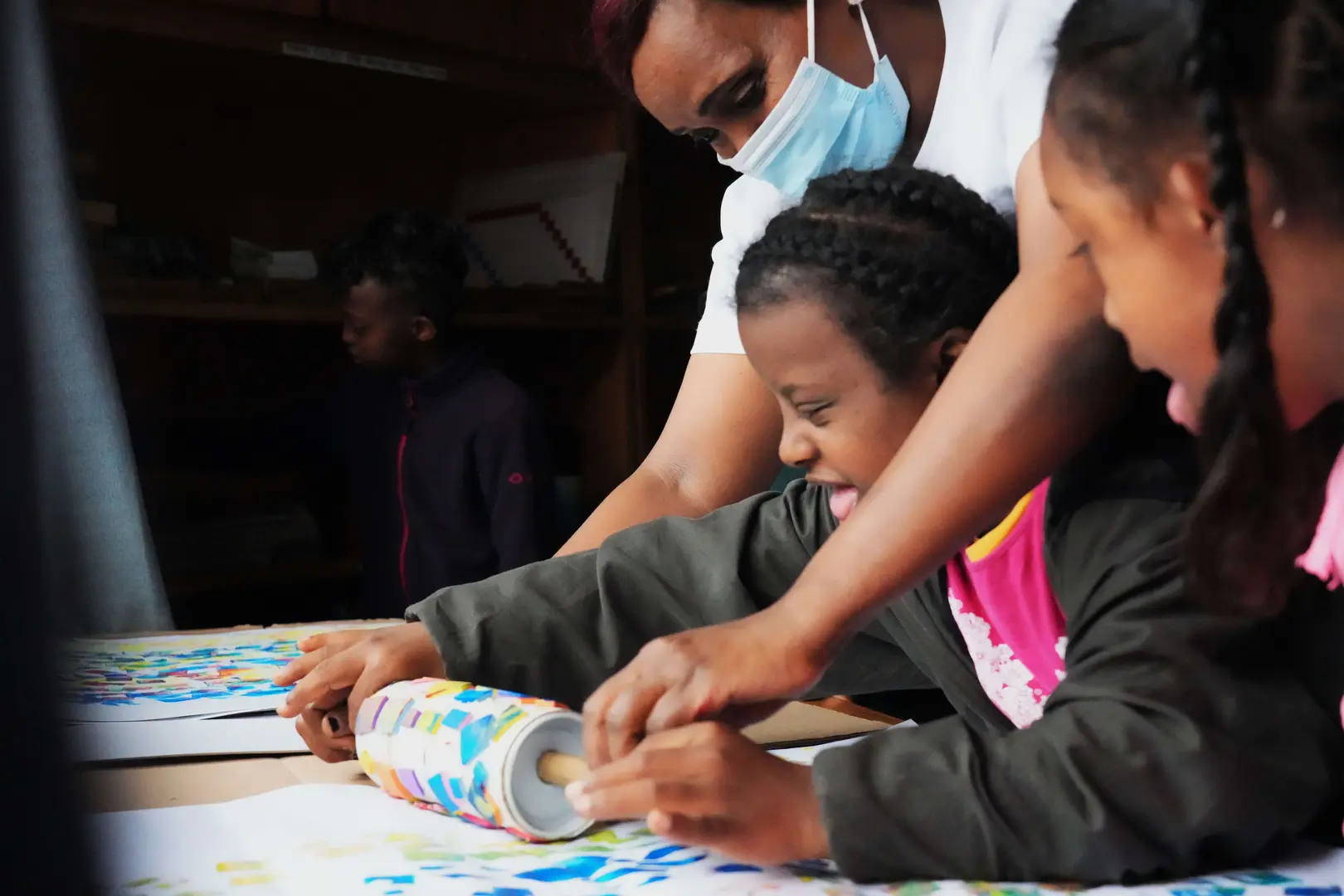Bedrucken von unseren Theaterwänden. In der Holzwerkstatt des CMCC wurden Theater Spielwände gebaut und mit den Kindern anschliessend bedruckt.